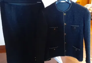 Elegante completo nero composto da giacca e gonna interamente realizzato su misura da una sarta. Tessuto tipo boucle' caldo e strutturato, rifiniture curate nei minimi dettagli. Giacca con bottoni dorati/neri decorativi, bordini con perline dorate, quattro piccole tasche nel davanti, nel fondo delle maniche due bottoncini e perline oro decorative, spalline e fodera interna. Gonna coordinata linea dritta ed elegante con elastico in vita che è coperto da una cintina lavorata che è applicata anche sul fondo della gonna. Ottime condizioni indossato pochissimo ha tutte le perline e bottoni ben applicati, nessun difetto. Naturalmente n