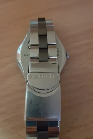 Orologio Swatch Irony Big Mahagany, il quadrante presenta un motivo sunburst marrone, bracciale originale in acciaio inossidabile finemente lavorato con le sezioni centrali rivestite in marrone che riprende il colore del quadrante, indicazione della data e del giorno, resistente all'acqua con preciso movimento al quarzo con batteria nuova. Funzionante, il cinturino presenta qualche naturale segno del tempo e il vetro ha solo un paio di piccoli graffi. Cassa diametro 34.
