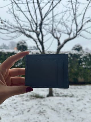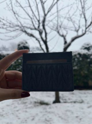 Elegante porta carte azzurro con un discreto logo. - Design trapuntato a zig-zag. - Materiale in pelle. - Finitura opaca.