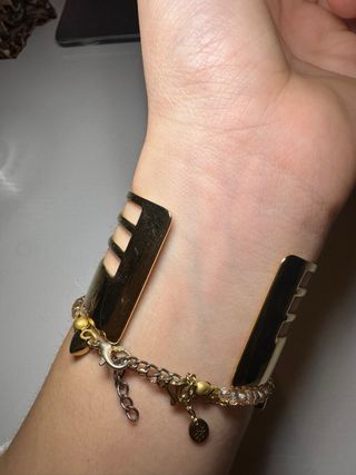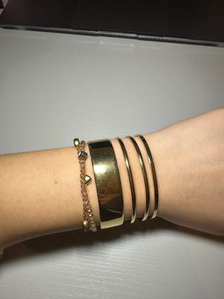 Elegante bracciale in oro, composto da una parte rigida e una catena sottile con dettagli. - Bracciale rigido effetto lucido. - Bracciale a catena con perline e ciondoli a forma di cuore. - Chiusura regolabile.