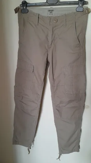 Pantaloni cargo Carhartt beige della linea Military Tactical Pant in tessuto ristop leggero. Taglia 26/30 (vita 26 pollici/66 cm e lunghezza 30 pollici/76 cm) che corrisponde a 40 italiana circa o 34 EU. Hanno fibbie metalliche laterali regolabili, tasche anteriori e posteriori, tasche cargo sui lati, doppio strato sul ginocchio e chiusura con bottone e zip.