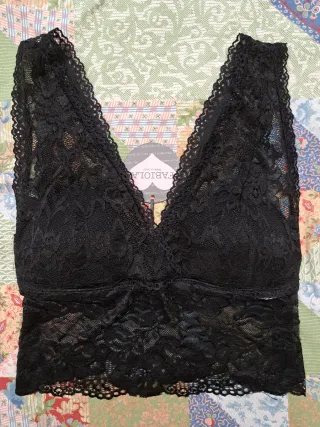Bralette in pizzo nero, taglia S, nuovo con etichetta. - Tessuto in pizzo delicato. - Coppe leggermente imbottite. - Design a V profondo. - Orlo con dettagli in pizzo.