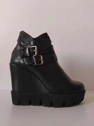 Stivaletti in pelle nera con zeppa e dettagli in metallo. - Zip laterale. - Doppia fibbia regolabile. - Suola platform carrarmato.