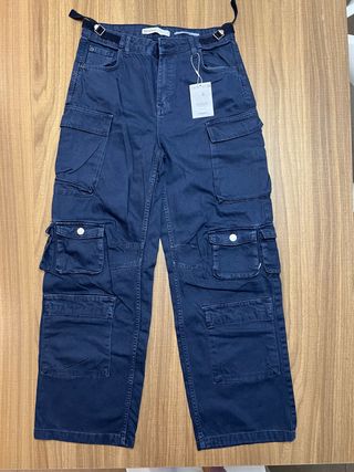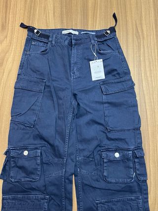 Pantaloni cargo in denim di Bershka. - Tasche multiple sui lati. - Cintura con passanti e cintura in tessuto. - Chiusura con zip e bottone.