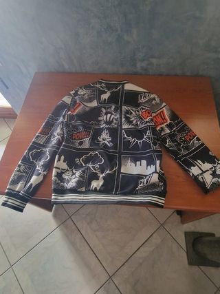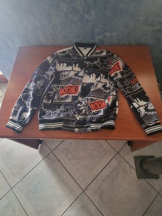 Giacca stile varsity con maniche a contrasto. - Design bicolore nero e bianco. - Chiusura frontale con bottoni. - Collo e polsini a costine. - Patch a tema R sul petto. - Stampa grafica a forma di picche sul fondo.
