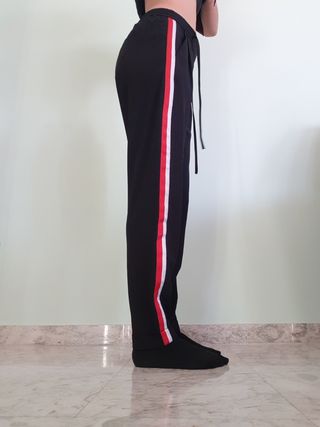 Pantaloni sportivi vintage con un design a righe laterali. Design a righe rosse e bianche, vita elasticizzata con coulisse e gamba dritta. Vestono molto comodo addosso. Ottime condizioni generali. In vita hanno una piccola cucitura aperta eventualmente da sistemare. Taglia personale 42