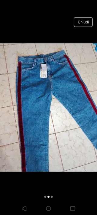 Pantaloni jeans Calzedonia con una banda laterale in velluto rosso. - Vestibilità comoda. - Design moderno e sportivo.