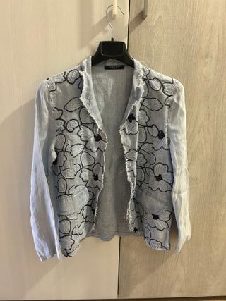 Elegante giacca estiva da donna, perfetta per completare il tuo look con un tocco di stile. TG. S - Tessuto in lino leggero e traspirante. - Design floreale ricamato con perline. - Orlo sfrangiato per un look moderno.