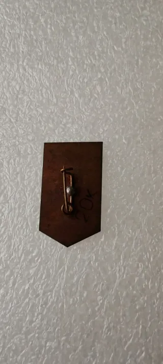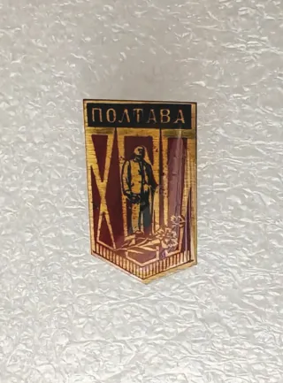 Spilla commemorativa con la scritta Poltava e una figura. - Design a forma di scudo. - Dettagli in smalto rosso e oro. - Raffigurazione di una figura con fiori alla base.