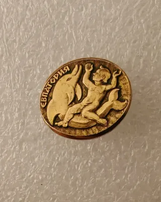 Spilla vintage raffigurante un bambino con un delfino, con la scritta Evpatoria. - Materiale: metallo dorato. - Design: bambino che cavalca un delfino. - Scritta: Evpatoria in cirillico.
