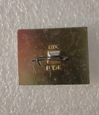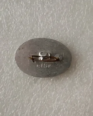 Spilla vintage con un disegno dettagliato. - Raffigura una figura maschile con barba e un elmo. - Presenta iscrizioni in cirillico. - Dettagli di una nave e simboli. - Materiale metallico.