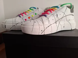 Scarpe sneakers bianche con un design unico e colorato. - Tomaia in pelle bianca. - Dettagli di vernice nera. - Lacci arcobaleno vivaci. - Suola platform bianca. - Borchie laterali multicolore.