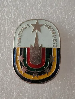 Spilla commemorativa delle Universiadi di Mosca del 1973. - Design con stella e arco colorato. - Dettagli in argento.