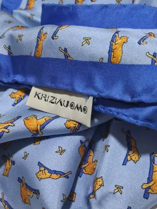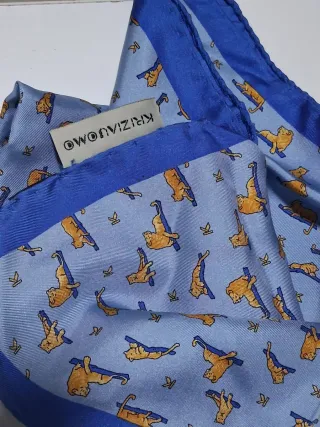 Elegante pochette in seta con fantasia. - Tessuto: Seta - Fantasia: Tigri e uccelli - Colori: Azzurro, arancione e blu Misure : cm 48x 48 NOTA BENE : da stirare