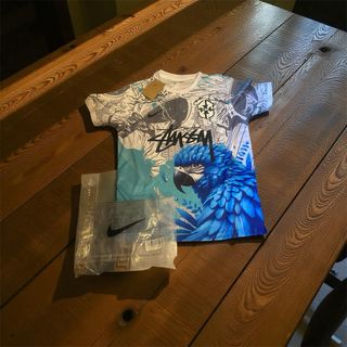 Maglietta con una stampa vivace e dettagliata. - Design con pappagallo blu e elementi grafici. - Logo Stussy in evidenza. - Logo Nike presente.