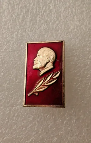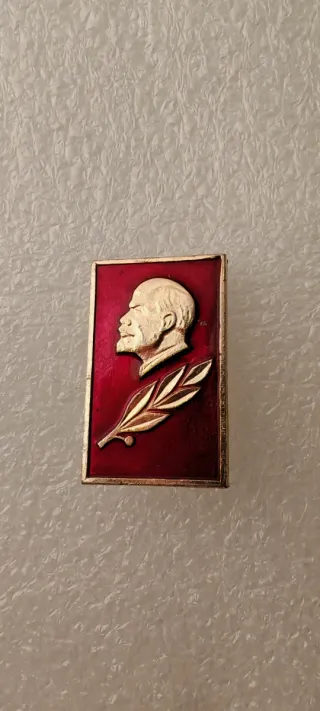 Spilla commemorativa con il profilo di Lenin. - Design rettangolare con bordo dorato. - Sfondo rosso intenso. - Raffigurazione in rilievo di Lenin e una foglia d'alloro.