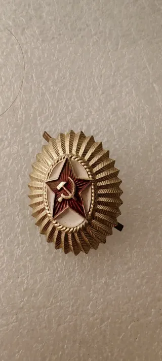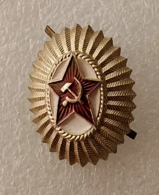 Spilla distintivo dell'Unione Sovietica. - Stella rossa smaltata. - Martello e falce dorati. - Cornice esterna a raggiera dorata.