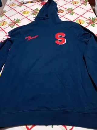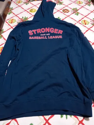 Felpa con cappuccio blu con logo S e scritta Stronger. - Logo S rosso e bianco sul petto. - Scritta Stronger rossa sul petto. - Tasca frontale a marsupio.