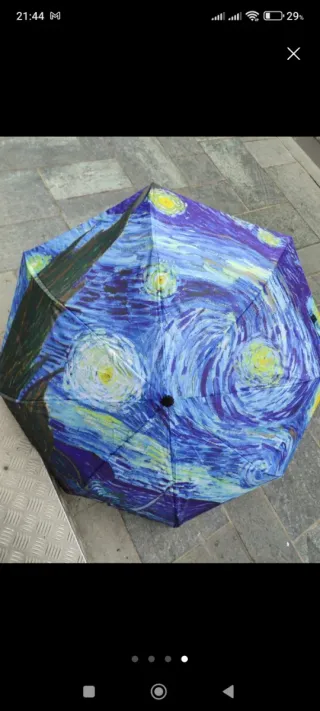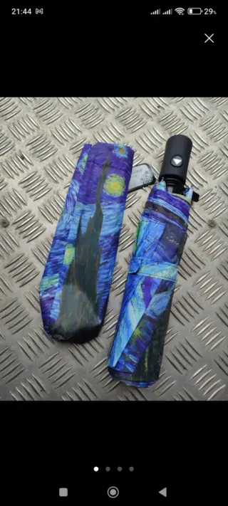Ombrello con una stampa ispirata al celebre dipinto Notte Stellata di Vincent Van Gogh. Un pezzo unico per portare con te un'opera d'arte. - Design artistico ispirato a Van Gogh. - Motivo Notte Stellata vibrante. -Antivento, con foderino alta qualità, apertura con pulsante.