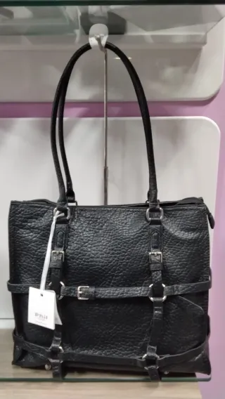 Borsa a spalla in similpelle nera con dettagli in metallo. - Texture martellata. - Nuova con cartellino originale . - Chiusura con cerniera e divisorio interno. - Dettagli con fibbie e cinturini gothic style.