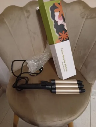 Piastra per capelli con tre cilindri per creare onde. - Design elegante in nero e oro. - Ideale per styling professionale a casa.