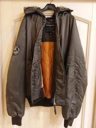 Bomber vintage con cappuccio e fodera trapuntata. - Patch rotondo sul braccio sinistro. - Zip frontale. - Tasca sulla manica sinistra. - Cappuccio con bordo in pelliccia sintetica.
