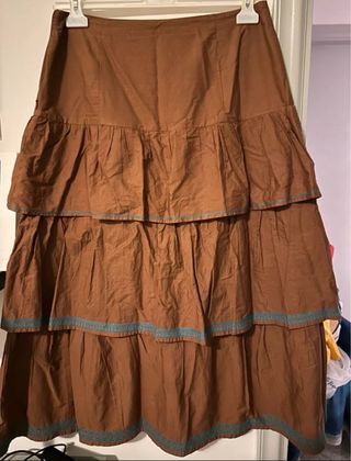 Gonna lunga marrone con un design a balze. - Tessuto in cotone. - Dettagli con bordino azzurro. - Lunghezza midi/maxi.