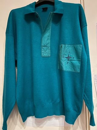 Maglia da uomo Viky. Con inserti in cotone lunghezza 68 lana50% acrilico50% - Taglia 50/L. - Colore verde smeraldo. - Zip frontale. - Tasca con zip.