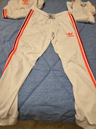 Set composto da tre pezzi della tuta Adidas Chile 20, felpa, giacca e pantaloni, tutto taglia M, colore bianco con strisce laterali arancione rosso e nero - Felpa con cappuccio. - Pantaloni. - Giacca. - Logo Adidas a contrasto.
