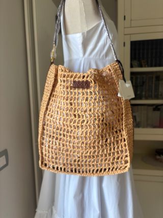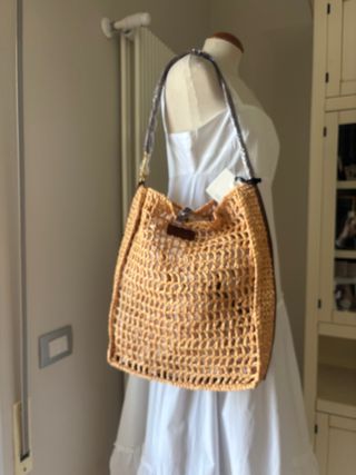 Panama bag in raffia a spalla. Chiusura con linguetta pelle e perno e anello in metallo dorato. Dettaglio logo stampato su targhetta in ecopelle cucita frontalmente. tracolla in ecopelle con gancio in metallo. Finiture in metallo dorato. Fondo interno della borsa e bordatura esterna in ecopelle. Raffia intrecciata a maglie. Brand Vicolo (collezione p/e 2026) Prezzo retail 99€ Splendida borsa per la primavera/estate, per le lunghe passeggiate al tramonto, per le vacanze, per il mare, un aperitivo tra amiche. Sbarazzina, fresca, leggera. Misure generose Larghezza Misura: L. 37 cm Altezza 70 cm Profondità 10 cm