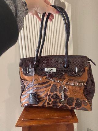Borsa tote in pelle con un design unico e accattivante. - Materiale: Pelle - Colore: Marrone e multicolore - Dettagli: Patchwork di diverse texture animalier, catena decorativa, charm a cuore.