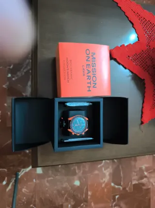 Orologio Omega Mission on Earth nella colorazione Lava. Presentato nella sua scatola originale. - Collezione Bioceramic MoonSwatch. - Design distintivo con dettagli arancioni.