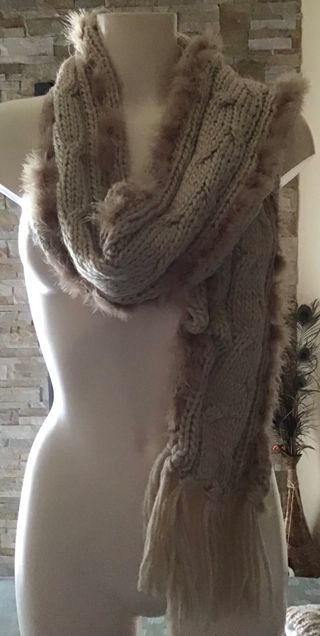 Set coordinato di sciarpa e cappello in maglia, perfetti per completare il tuo look invernale. Sciarpa: Larga 14cm e lunga 75cm Dettagli in pelliccia sintetica e frange decorative Cashmere, lana acrilico Brand Parah Mai usata Berretto: Misure 22x20 con fodera interna in pile aggiunta in seguito come antivento No brand
