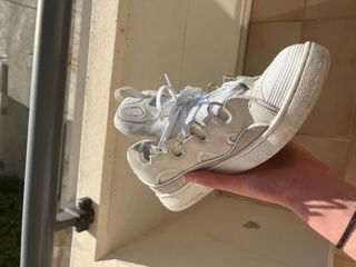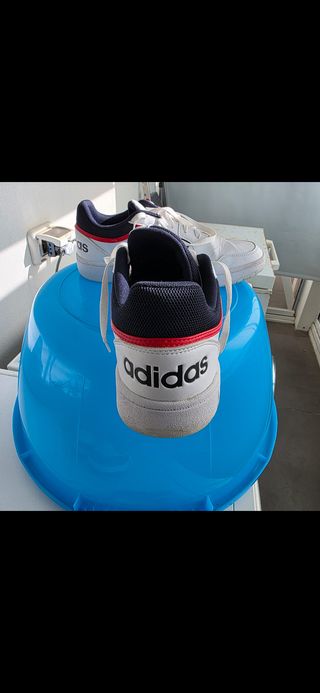 Scarpe Adidas in buone condizioni, con dettagli bianchi e blu. - Logo Adidas sul tallone. - Design sportivo.