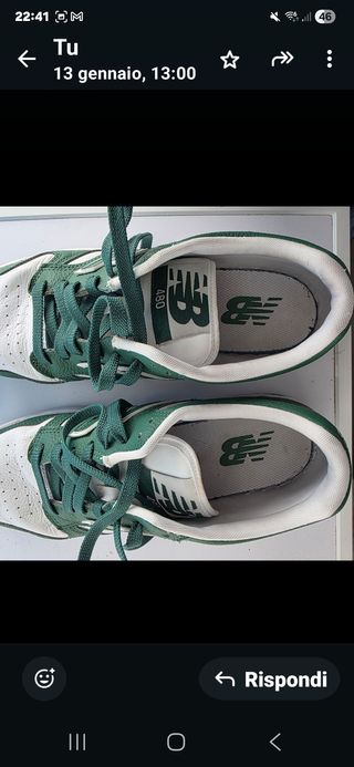 Scarpe New Balance modello 480. - Tomaia in pelle bianca con inserti verdi. - Lacci verdi. - Logo New Balance sul lato e sulla linguetta. - Suola in gomma.
