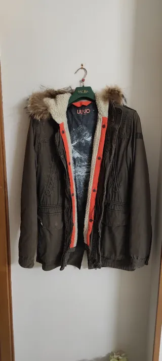 Cappotto parka Liu Jo uomo colore verde militare chiusura con zip e automatici, 4 tasche sul davanti (2 a filetto verticale sul petto con bottoni a clip nascosti e due a toppa con pattina con bottoni a clip nascosti), cappuccio con elastico regolabile e pelo removibile con bottoni. Cordoncino regolabile in vita, pelo grigio all’interno del cappuccio e sul davanti all’interno del parka. Fodera interna con stampa fantasia lunare e tasca interna. Misura XL