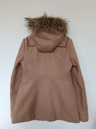 Elegante cappotto stile Montgomery, perfetto per le giornate più fresche. Presenta dettagli curati e un design classico. - Cappuccio con pelliccia sintetica. - Chiusura con alamari e bottoni. - Tasche frontali applicate. - Fodera interna. -Presenta alcuni difetti dell'ecopelle e una macchiolina all'interno dell'abbottonatura. A parte questo il cappotto è portabile e tenuto bene.