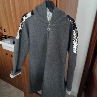 Vendo giacché tipo felpe non sportive taglia unica. Una color ocra, una grigia con strass sulle spalle. Vendo singolarmente a 10€ l'una, mentre insieme 15€.