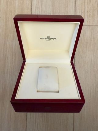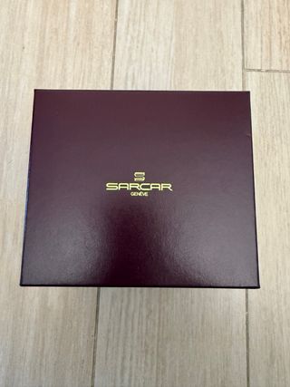 Elegante scatola e controscatola del marchio Sarcar Geneve. - Colore viola intenso. - Logo dorato del marchio. - Ideale per conservare oggetti preziosi o come confezione regalo.