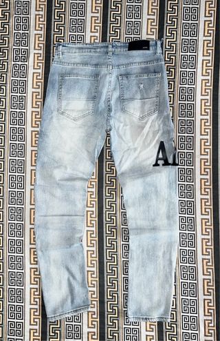Jeans Amiri da uomo in denim blu chiaro con strappi. - Logo Amiri nero sul davanti. - Dettagli strappati sulle ginocchia e sulle cosce. - Vestibilità moderna.
