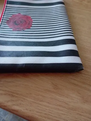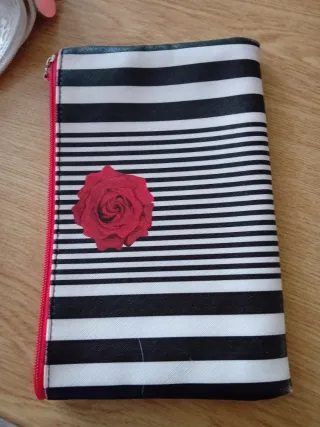 Elegante pochette per il trucco con un design a righe bianche e nere. Presenta una bellissima stampa di una rosa rossa. - Chiusura con cerniera rossa. - Motivo a righe orizzontali. - Dettaglio floreale applicato.