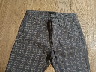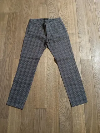 Pantaloni modello "Slim Fit" TG. M da uomo con fantasia a quadri su sfondo a tinta unita di colore grigio scuro, tasche laterali all' americana, passanti per la cintura in vita, tasche sul retro con chiusura a bottoncino e tessuto 98% cotone e 2% elastan. Questi pantaloni sono versatili e adatti sia per un look casual chic, se abbinati a una polo o a un maglioncino, sia per occasioni più formali o di lavoro se indossati con una camicia e una scarpa stringata.