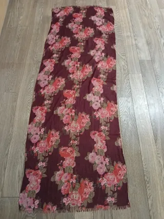 Usata in ottime condizioni. Pashmina taglia unica da donna con fantasia floreale su sfondo a tinta unita di colore bordeaux e frange su entrambe le estremità. MISURE: 71×195 cm.