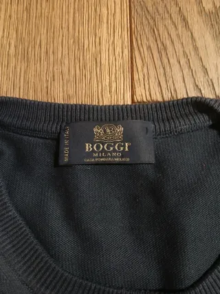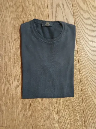 Usato in ottime condizioni. Maglione girocollo per la mezza stagione, tinta unita di colore blu scuro; TG. XL da uomo con polsini sulle maniche e tessuto elasticizzato in vita. Composizione tessuto 100% cotone. MISURE: spalle 43 cm, da ascella a ascella 55 cm e lunghezza 66cm.