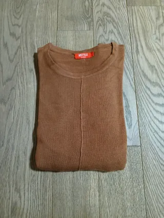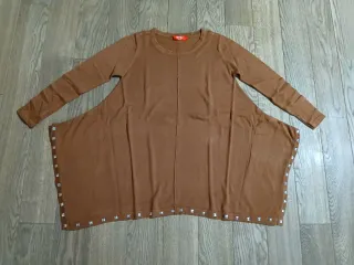 Usato pochissimo come nuovo. Maglione girocollo, tinta unita di colore marrone cammello, TG. S da donna con lunghezza asimmetrica e dettagli decorativi a borchie intorno all' estremità inferiore. MISURE: spalle 35 cm, da ascella a ascella 45 cm e lunghezza 73 cm.