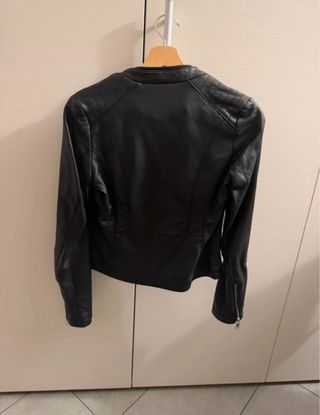 Giacca in ecopelle dal taglio moderno. - Chiusura con zip frontale. - Tasche laterali con zip. - Dettagli trapuntati sulle spalle. - Collo alla coreana.