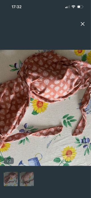 Costume da donna con una fantasia floreale su base arancione e rosa. - Taglia L/XL. - Design con spalline annodabili.