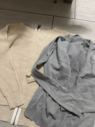 Set di due capi d'abbigliamento, un maglione beige e un cardigan grigio. - Maglione lavorato a maglia con zip. - Cardigan con chiusura a bottoni.