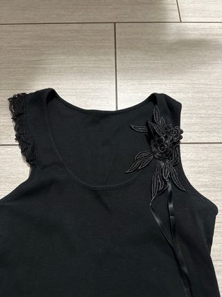 Canotta da donna con un tocco di eleganza. Presenta un'applicazione floreale sul davanti e dettagli in pizzo sulle spalline. - Applicazione floreale nera sul davanti - Dettagli in pizzo sulle spalline