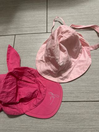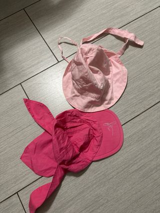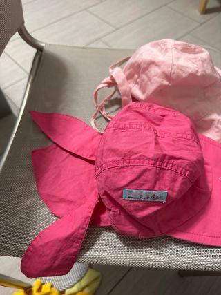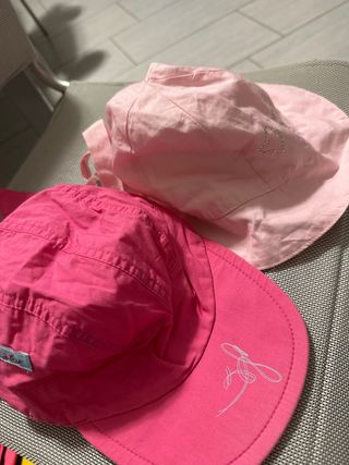 Set di due cappellini estivi, uno a visiera e uno a tesa larga. - Colore rosa vivace. - Ideali per proteggere dal sole. - Marchi Decathlon e Prenatal.